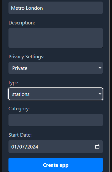 - 2. Go to `/apps` and press the 'Create App' button. Fill out the form as you want, except the 'Type' field, which should be selected as 'stations'. Press the 'Create App' button.