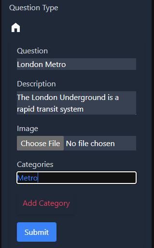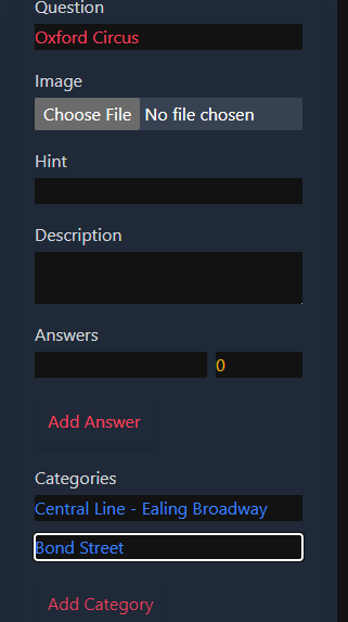 - Station on Line Moving to Start Station: - **Question Field**: Name of the station (e.g., 'Oxford Circus'). - **Description Field**: Information about the station. - **Hint Field**: Leave empty or use for additional notes. - **Categories Field**: - `categories[0]`: Question field of the line QCard (e.g., 'Central Line - Ealing Broadway'). - `categories[1]`: Question field of the 'to' connection which is next station in the way(e.g., 'Bond Street').