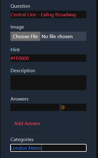 - Child QCards (Metro Lines): - **Question Field**: Name of the metro line with the start station name as a suffix (e.g., 'Central Line - Ealing Broadway'). - **Description Field**: Information about the line moving towards the start station. - **Hint Field**: CSS code for the line color (e.g., '#FF0000' for red). - **Categories Field**: - `categories[0]`: Question field of the parent QCard (e.g., 'London Metro'). - `categories[1]`: Leave empty.